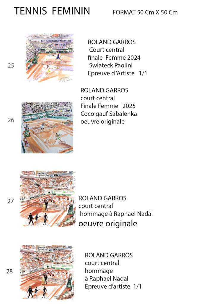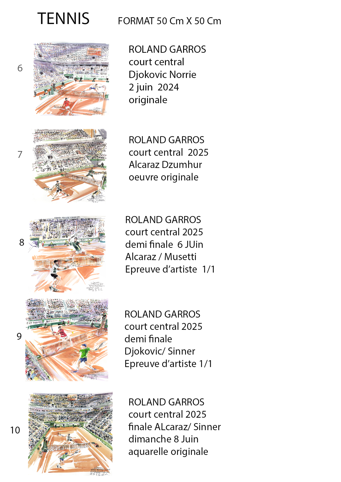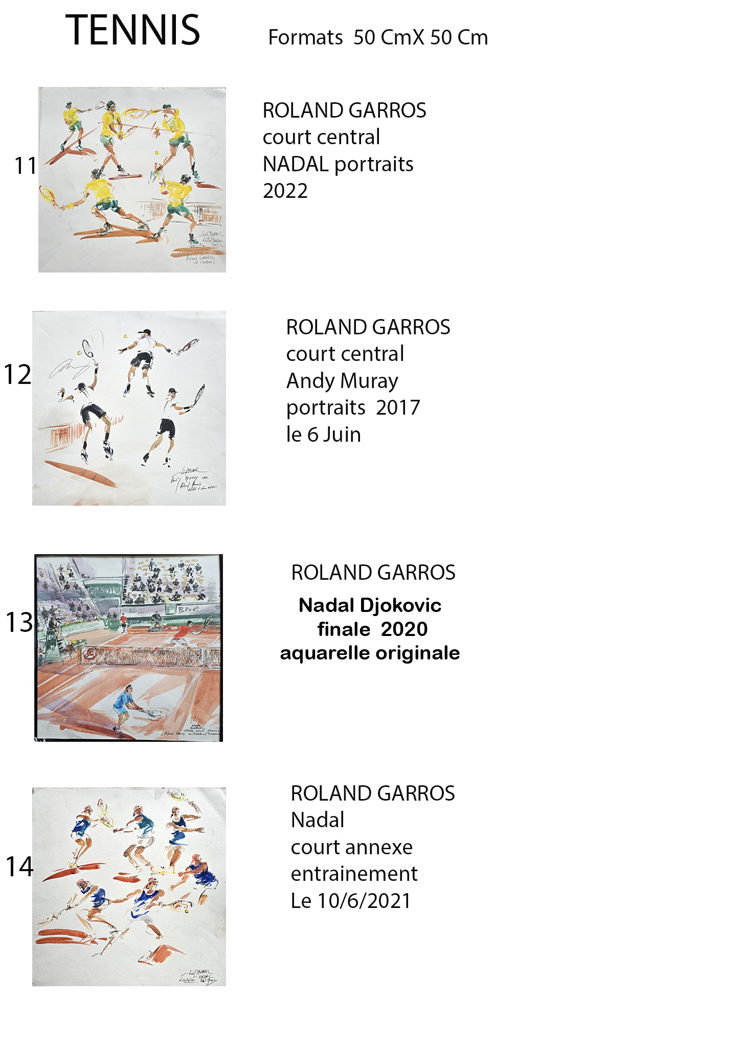 TOUTES LES AQUARELLES DE TENNIS DU TOURNOI DE ROLAND GARROS 2021 ONT POUR FORMAT. 50 Cm X 50 CM . et ont été réalisées dans le temps du match . disponible en original