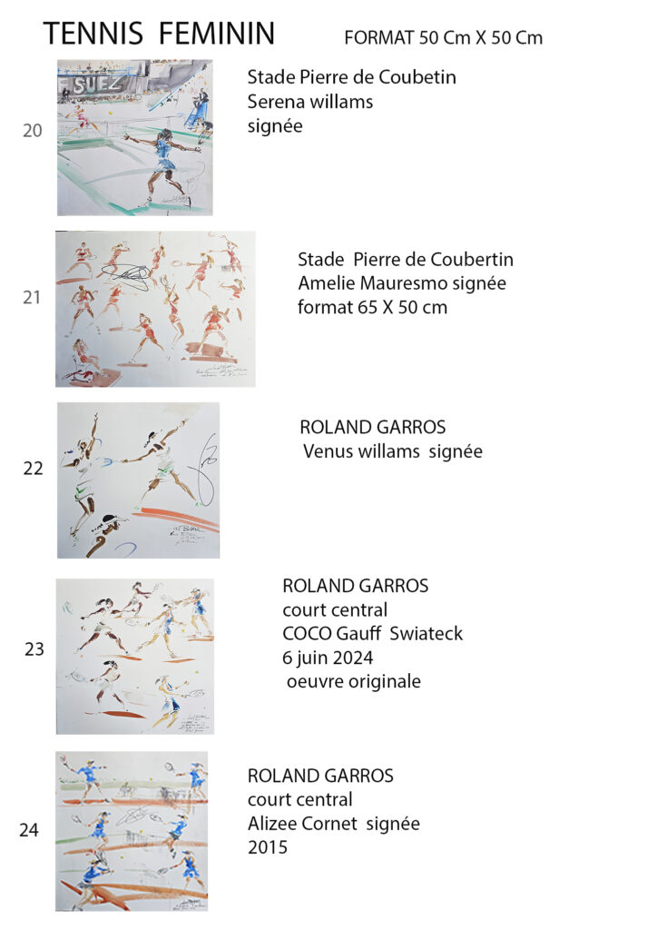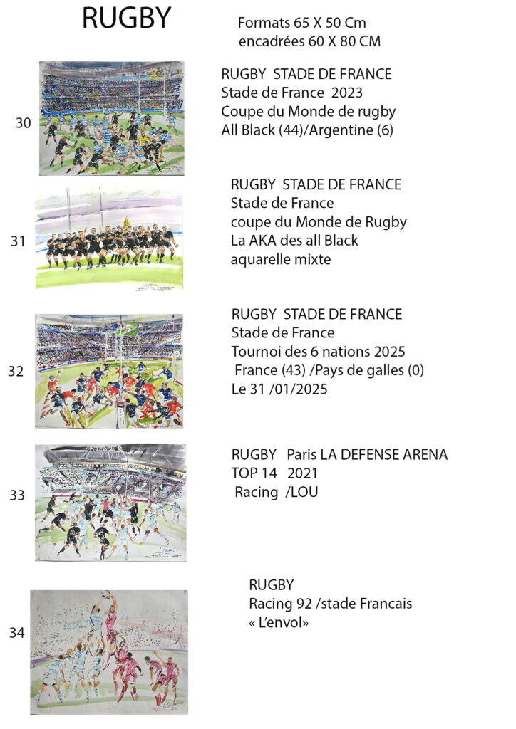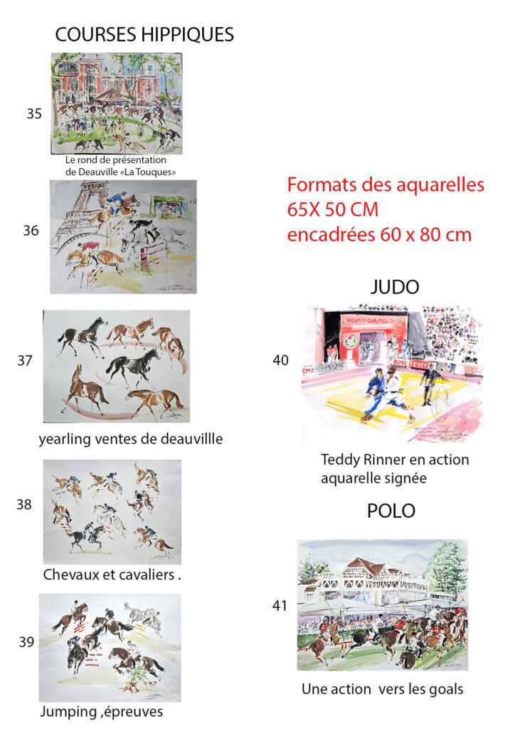Pour les AQUARELLES EN DIRECT DE SPORT vous pouvez préciser votre demande dans la rubrique CONTACT;afin de recevoir une planche de choix :Tennis , Rugby, Monde du cheval , autre sport ….. Merci