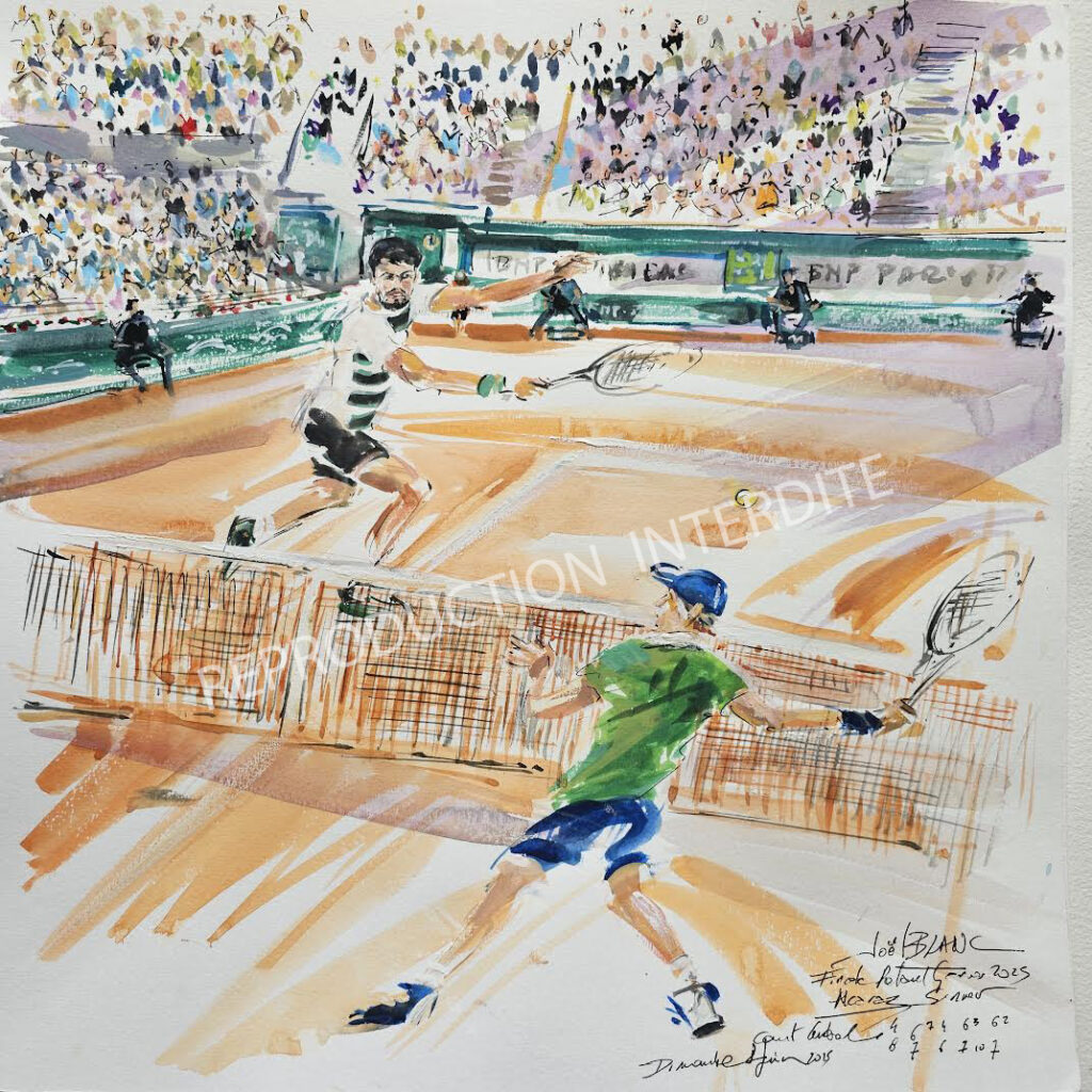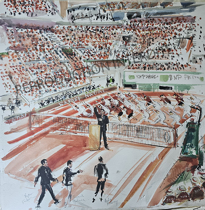 Les grands évènements sportifs m’offrent une source d’inspiration inépuisable , un véritable défi pour moi : saisir les mouvements ,la beauté des gestes ,la grâce, la force des joueurs le temps d’une action de jeu .Mon regard voit ces matchs comme de véritables ballets ou de la danse plutôt que comme une course aux résultats, palmarès ou performances .Je laisse cela aux commentateurs sportifs très compétents pour ajouter au Sport un autre regard :